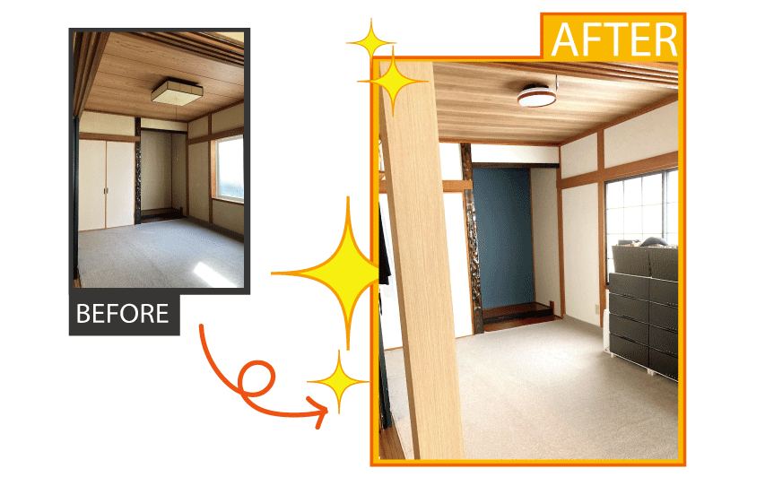 担当者より一言! | 今回のリフォームは、お母さまと同居を控え、お部屋を用意したいという施主様からのご相談がきっかけでした。 その他にも断熱工事・トイレの取替などもご希望でしたが、 数年後は新築かリノベーションをご検討中とのことで、 それであれば「今は最低限のリフォームにして、数年後の本格的なマイホーム実現に向けて計画立てて準備をしていく」ことをおすすめし、 先の事を見据えてアドバイスをさせていただきました! |